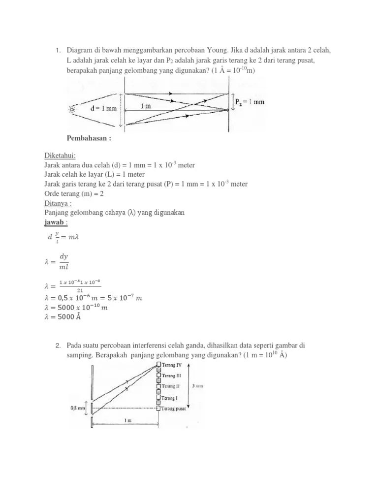 Contoh Soal Interferensi Celah Ganda Percobaan Young Penyelesaian Soalfismat Contoh Soal Percobaan Young Dan harapannya apa yang admin bagikan kali ini dapat membantu anak didik dalam memahami dan mengerjakan soal-soal seputar teks laporan percobaan yang diujikan. Sebuah kisi difraksi dengan konstanta kisi 500 gariscm digunakan untuk mendifraksikan cahaya pada layar yang berjarak 1 m dari kisi. |